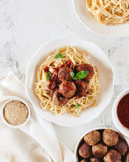 5. Coacem chiftelele pentru 20-25 minute la 180 grade, în cuptorul preîncălzit. Dacă este nevoie, le rotim la jumătatea timpului, pentru a se rumeni uniform. Dacă doriți, puteți să le prăjiți, însă eu prefer să le coc la cuptor, iar înainte de servire să le încălzesc pe aragaz într-o tigaie antiaderentă. Servim chiftelele de soia cu o salată, un piure, sau așa cum am făcut eu, alături de o porție de paste cu sos de roșii.