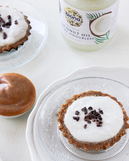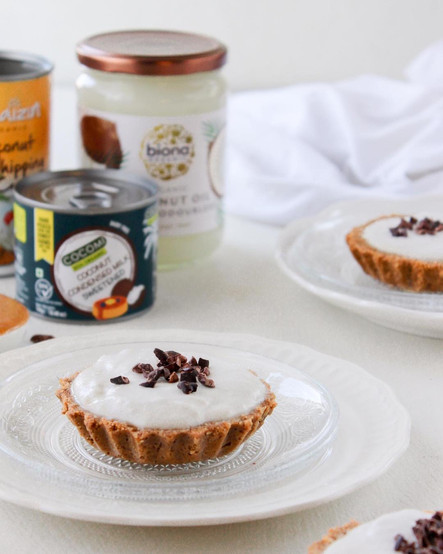 2. Pentru crustă mărunțim biscuiții cu ajutorul unui robot de bucătărie sau al unui sucitor. Amestecăm pudra obținută cu uleiul de cocos moale, până ajungem la textura nisipului umed. Această compoziție o presăm cu grijă în formele de tarte, după care dăm aceste forme la rece până crusta se întărește complet.