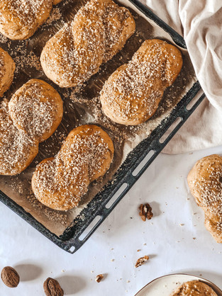 Chiar dacă mucenicii nu fac parte din amintirile copilăriei mele pentru că în Ardeal nu sunt atât de des întâniți, îmi amintesc totuși cum în liceu mâncam mucenici în pauzele dintre ore. Mereu mi se păreau a fi un cozonac to go și îmi plăceau tare mult, așa că anul acesta am decis să recreez și eu rețeta într-o variantă vegană. În loc de miere am folosit sirop de agave, însă siropul de orez funcționează la fel de bine. În aluat însă am folosit zahăr brun, așa că aceasta nu este o variantă sugar free, însă dacă nu doriți să folosiți zahăr normal, puteți să folosiți zahăr de cocos. Culoarea aluatului va fi una mai închisă în acest caz, însă pentru a rezolva problema eu am adăugat puțin turmeric.